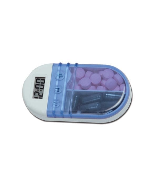 Vreckový dávkovač liekov s časovačom a dvoma priehradkami na lieky.